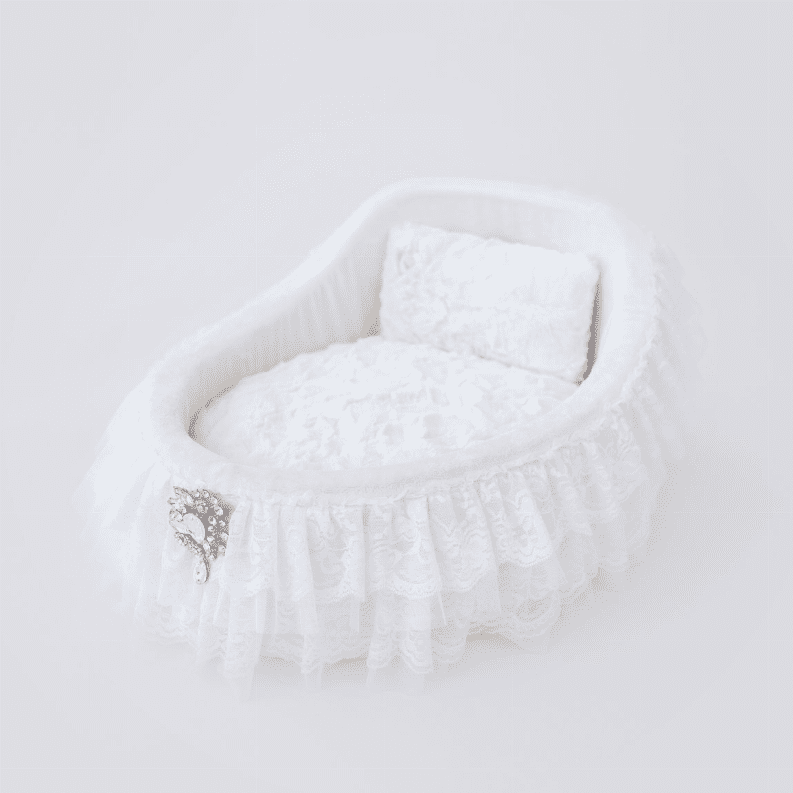 For that beautiful addition to your family, you'll want your pup to have sweet beginnings in our adorable Crib Bed by Hello Doggie, to lull your baby into sweet dreams. Trimmed in two-tiered romantic handmade lace, our cribs also feature a bouquet drop crystal brooch and removable pillow for easy care. Pair with any Hello Doggie Blanket. You'll be the envy of all your friends! Our collection offers four soft colors to choose from.