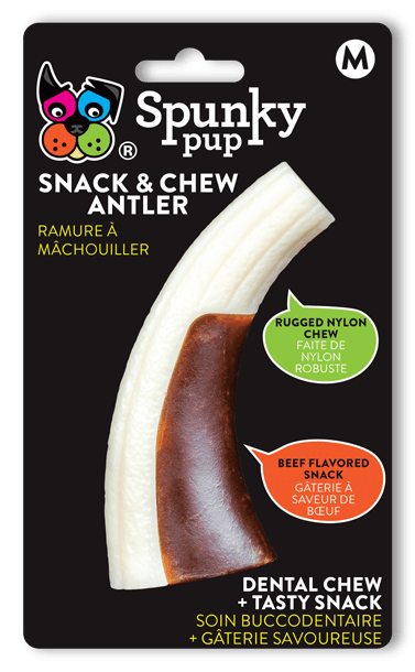 Your dog will love the Snack & Chew Antler from Spunky Pup! This 2-in-1 toy is made from rugged nylon with an embedded, beef-flavored treat.