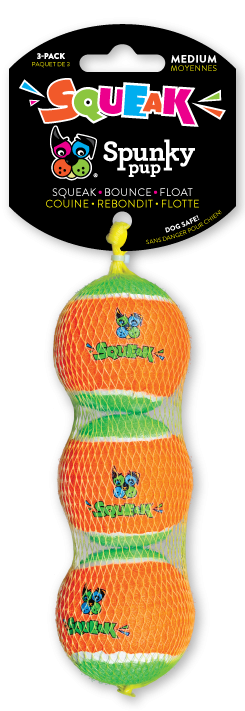 Squeaky Tennis Balls by Spunky Pup feature a durable embedded squeaker.