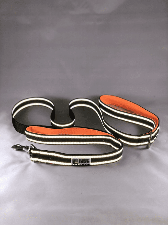 Another problem solved by the Headlight Harness Family! Do you find yourself constantly rolling your leash up around your arm to keep your dog close by? Not anymore! With our highly reflective, double handled leashes, simply use the lower handle to keep your dog at your side. Available with handles in Orange, Blue, Grey, Pink or Purple. All of our leashes are 6 feet in length, have padded foam handles for added comfort, and highly reflective stitching to keep your walks comfortable and safe in any conditions!