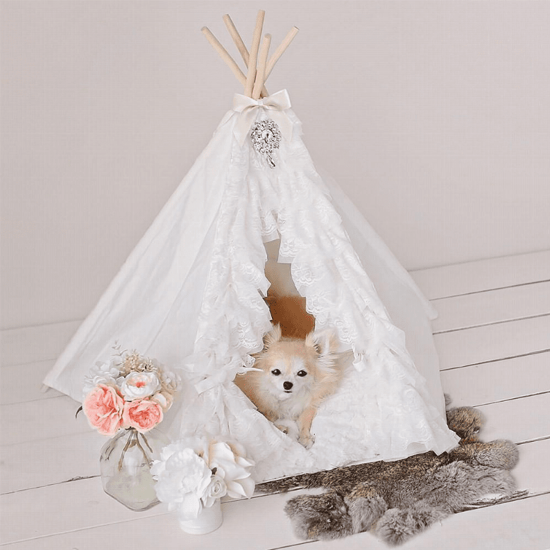 This extravagant luxury Lullaby Teepee handcrafted by Hello Doggie is adorned with delicate cascading lace and embellished with a crystal brooch for that finishing touch of elegance. The Lullaby Teepee is a perfect hideaway for a quiet afternoon nap. Complete with a removable stuffed pillow for extra comfort and tie-backs for opening or closing.