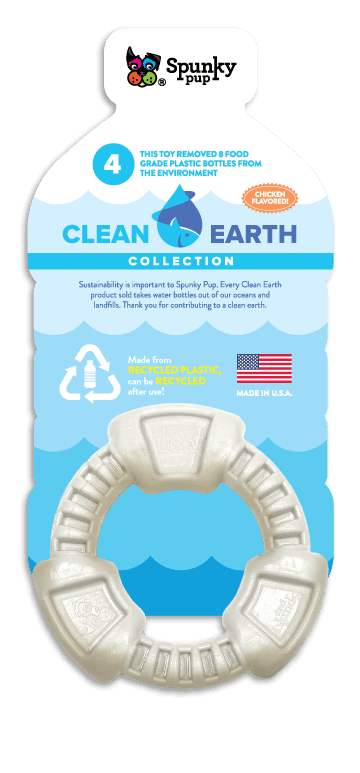 Clean Earth chew toys are super-durable and and feature Chicken Flavoring your dog will love. Not only are Clean Earth toys recyclable, but each toy can be recycled when you dog is done playing with it ... which means Infinite Loop Recycling!