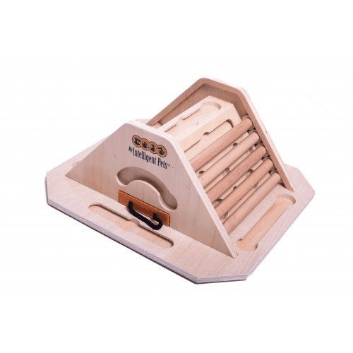 Length: 14.00 Width: 16.00 Height: 6.00 Pyramid This is a complex game with many tasks to solve by the dog. The parent can regulate level of difficulty (from 1 to 4 paws) by adding and removing parts where treats are hidden. This tridimensional puzzle in shape of a pyramid is ideal for middle size and large breed dogs. It comes with two drawers and 21 tokens (11 "cylinders" and 10 "hats"). Pyramid is an excellent tool in exercising dog's concentration skills and provides great opportunity for interaction between a parent and his/her pet. According to dog's behaviorists 10 minutes of mental stimulation with employment of interactive game equivalents to 1 hour of physical exercise. This is especially important for the dogs living in large cities where long walks are difficult and impossible , senior dogs with ailments that do not allow them for prolong outings and those living in cold climates where going outside can put animal's health at risk.. How to play: 1. Hide as many treats as you like in the openings beneath the movable parts and cover them. Then place cylinders in the circular indentations and drawers and hide more treats under them. 2. Encourage your dog to start searching, first showing him where a treat is waiting. 3. The dog finds the treats by knocking down cylinders and pushing aside movable parts ("hats"), as well as pulling drawer's handle. Tip: Since Pyramid is one of most complex puzzles we designed, be patient with your pet, show him how the game works and encourage to search for the treats. This way you can make sure that your darling enjoys playing together with you and solves the task correctly, strengthening pet's confidence. Never let your pet play this game unsupervised, and intervene if he starts to chew movable pieces of the game. Regularly check cylinders for any damage such as splinters and nicks. Clean them by wiping with a damp cloth. Do not use abrasive cleaners. Additional information: Dimensions: 18"x16"x9" Weight: 8lb All our games and puzzles are made from certified wood covered with water-based varnish that is not harmful to humans and animals. Please keep the game dry and free of water exposure, as the wooden pieces may swell otherwise. Use only dry treats for playing with our games. Keep out of reach of small children since removable parts can be a choking hazard to them.