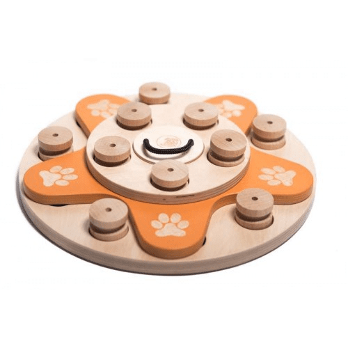 Length: 11.00 Width: 11.00 Height: 1.00 Dog's Flower Dog's flower is our other design in disk-shaped puzzles line, that aims to raise curiosity of your pet with circular object . Ten cylinders placed inside of two levels of wooden platforms require first removal of them from their designated spaces. Then the dog needs to spin flower-shaped platform in order to get to more treats awaiting him underneath. As with Birthday Cake puzzle, the parent can regulate the difficulty level from 1 paw to 4 paws by adding or subtracting the cylinders. May this "flower" brighten every day of your dog's life! According to dog's behaviorists 10 minutes of mental stimulation with employment of interactive game equivalents to 1 hour of physical exercise. This is especially important for the dogs living in large cities where long walks are difficult and impossible , senior dogs with ailments that do not allow them for prolong outings and those living in cold climates where going outside can put animal's health at risk. Additional information: Dimensions: 15"x13"x3" Weight: 3lb All our games and puzzles are made from certified wood covered with water-based varnish that is not harmful to humans and animals. Please keep the game dry and free of water exposure, as the wooden pieces may swell otherwise. Use only dry treats for playing with our games Keep out of reach of small children since removable parts can be a choking hazard to them.