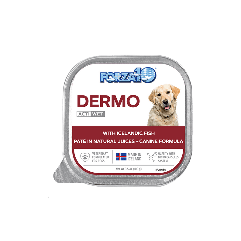 Length: 12.00 Width: 6.00 Height: 15.00 Forza10 Actiwet Dermo is a complete and balanced recipe designed to help support dogs with skin and coat issues, such as such as constant neck and back itching, crusts, redness, dermatitis, dandruff, dry and dull fur, hot spots, constant fur loss, and unpleasant skin odors. Made with delicious 100% Icelandic fish, and a mix of therapeutic plants and fruit extracts, which are great for skin issues, allergies, and physical wellbeing in dogs. The recipe is also made in Iceland with the highest quality ingredients in the world. It can be given alone, or you can mix it with Forza10's Active Dry Food. Forza10's recipes are free from all the bad stuff; never any GMOs, corn, wheat, soy, by-products, oxytetracycline, artificial preservatives, colors or flavors. Feel like a great pet parent by giving this super delicious and nutritious recipe to your pup!