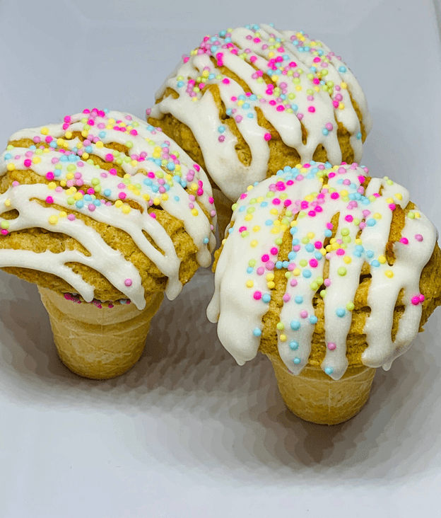 Cinnamon, honey cake ball placed on top of a miniature vanilla ice cream cone that has been dipped in peanut butter and rolled in sprinkles, then topped with vanilla icing and more sprinkles. Cookie size is large. Sprinkles color is subject to change with the season/holiday.